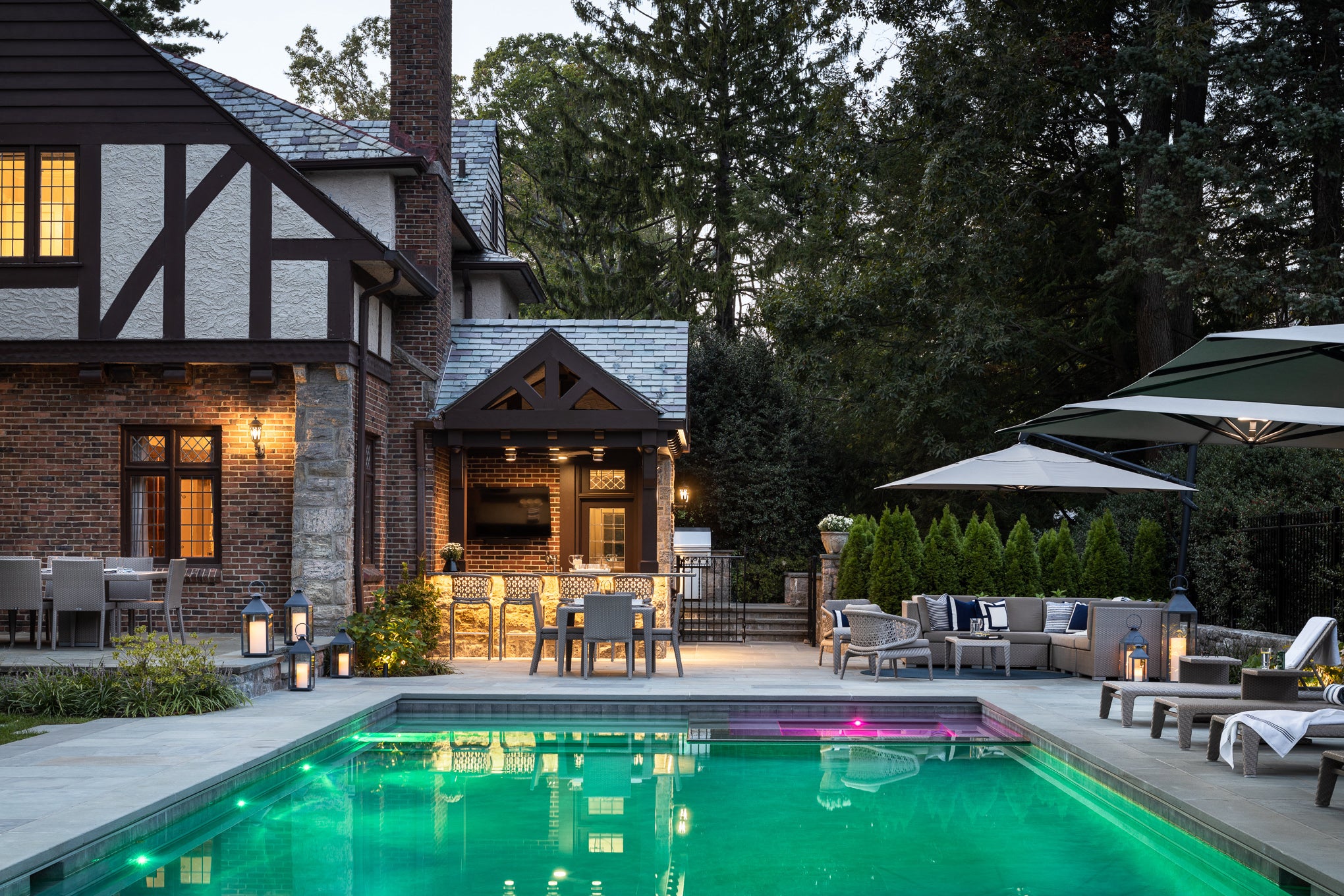 A recent construction in New Rochelle, New York, involved the addition of a free-standing pool cabana and patio environment that would still fit within the architectural context of the adjacent, early 20th century Tudor home on the property. Kurth’s aim was to unify the preexisting and the new, down to the finest detail. She chose “two beautiful pieces that are jewelry for the project”: Baldwin’s Boulder handleset as the exterior hardware for the entry and corresponding pocket door set for the custom-made leaded-glass door inside, both in Distressed Oil Rub Bronze. The slightly aged effect of the finish carried over to the other fixtures inside and around the pool, as well as the smoky blue tones of the slate roof.