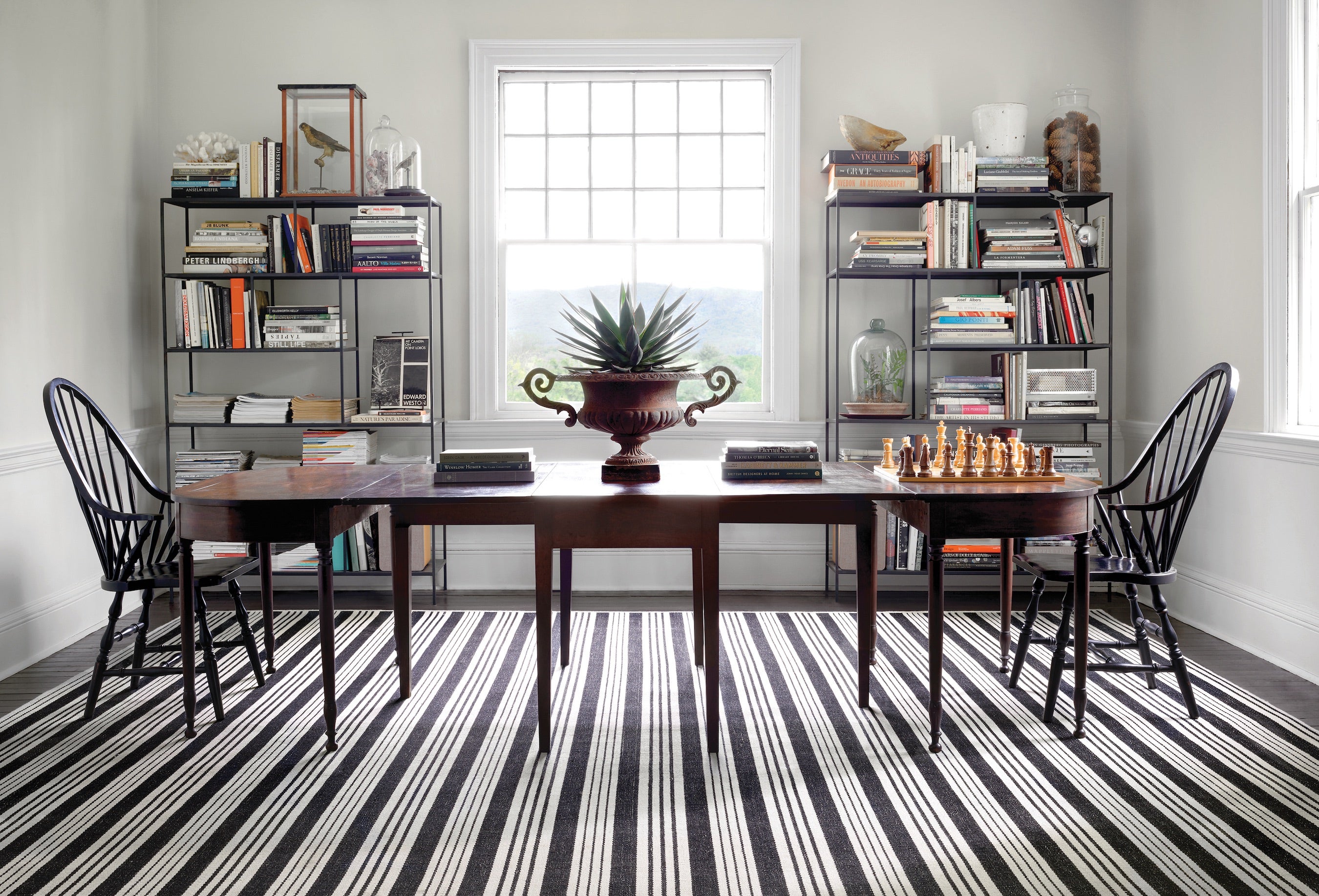 “2024 will be Annie Selke’s 10-year anniversary of collaborating with Bunny Williams for our Dash & Albert brand. We knew our designer clients would appreciate custom offerings from her collection because we’ve had a lot of tried-and-true success with her rugs in standard sizes,” says Evans. The legendary decorator’s signature combination of tradition and fun is apparent in all her patterns, beginning with the perennially popular cotton striped rugs. The partnership also prioritizes fair labor practices for the craftspeople who create each piece by hand and sustainability in the materials, from jute and wool to performance fibers. “In Black, Grey and Navy, Samson is one of our bestselling indoor-outdoor, go-anywhere styles,” says Evans. “It instantly makes a space feel put together yet welcoming.” Woven of polyester fiber developed from recycled plastic bottles, the reversible, lightweight, fade-resistant design lends itself to all-weather, high-traffic areas like foyers and porches. With its heathered texture, Bella in Navy or Grey wool is just as durable.