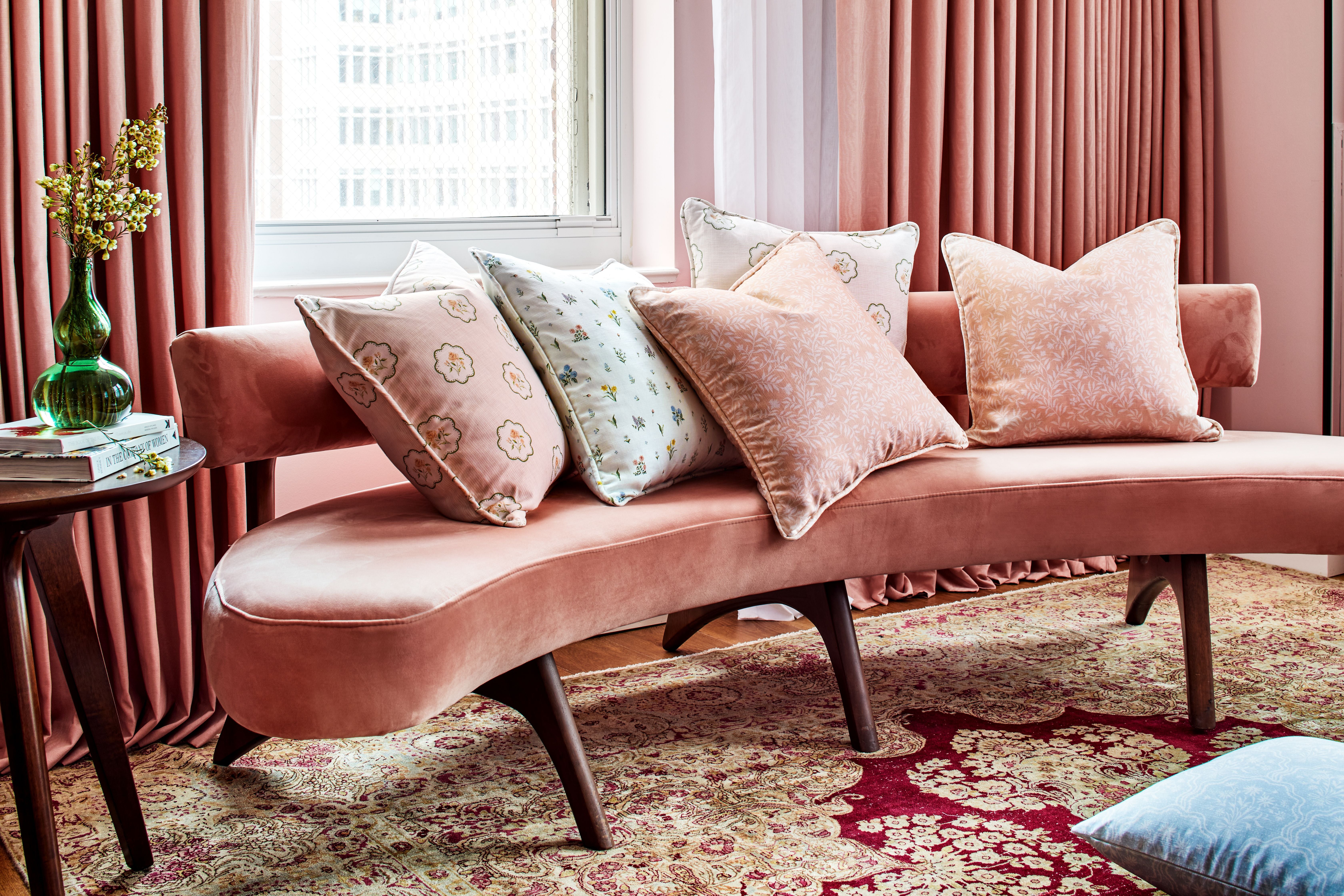 In 2017, Sheehey left her job as an elementary school teacher to become a full-time watercolor artist. From her studio in Falls Church, Virginia, she creates dainty illustrations of flora and fauna, often painting her signature blooms on items like seashells, satin ribbons, champagne bottles or even vintage handbags. It wasn’t long before her work caught the eye of interior designers on Instagram, and she started accepting commissions for watercolor room renderings. “That’s when I started to get really interested in interior design,” she says. “I was obsessed with reading about textile designers and realized how many of them started as artists. I’d always loved creating patterns in my work, and decided that it was something I should explore.”