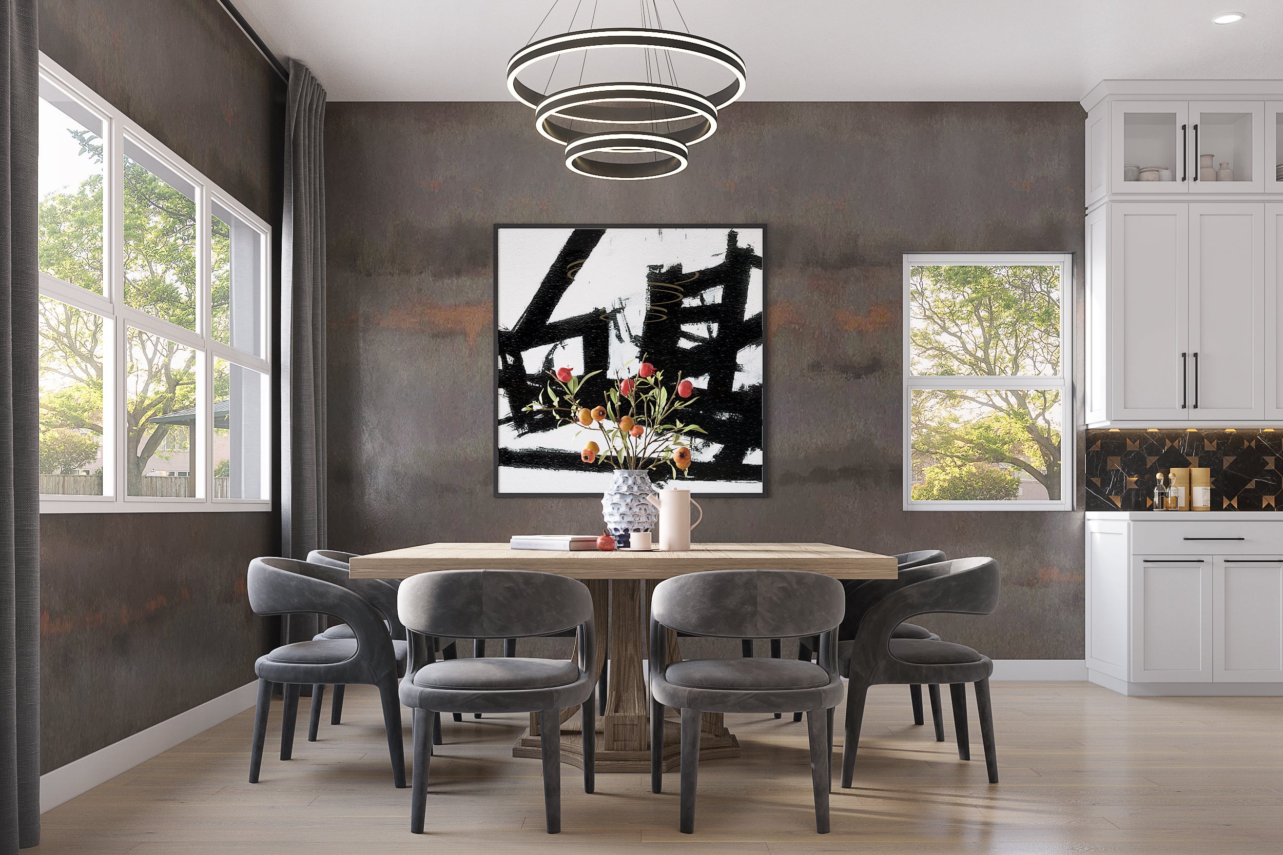 Photography: To help clients visualize a project, Gloribell Lebron uses detailed renderings like this open-concept dining and kitchen space with a deep, textured wallcovering. | Duke Renders